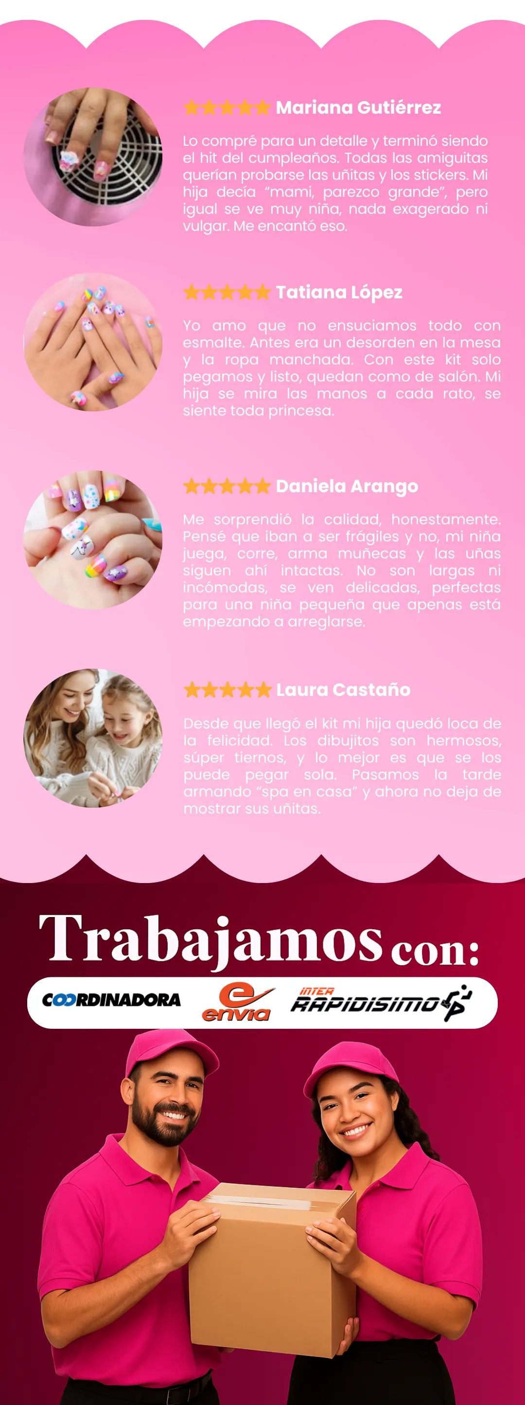 "Antes era un desorden con esmaltes y ropa manchada. Con este kit es solo pegar, decorar y ya. Mi hija vive mostrando sus manitos."